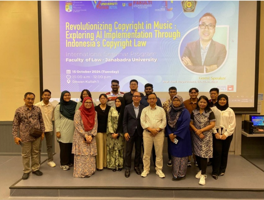 Fakultas Hukum Universitas Janabadra Yogyakarta (FH UJB) melaksanakan Visiting Profesor di Fakultas Undang-Undang Universitas Kebangsaan Malaysia (FUU UKM) pada 15 Oktober 2024. Kegiatan mengangkat tema ‘Revolutionizing Copyright in Music: Exploring AI Implementation Through Indonesia’s Copyright Law’. Sebagai dosennya Prof Tomi Suryo Utomo SH LLM PhD.