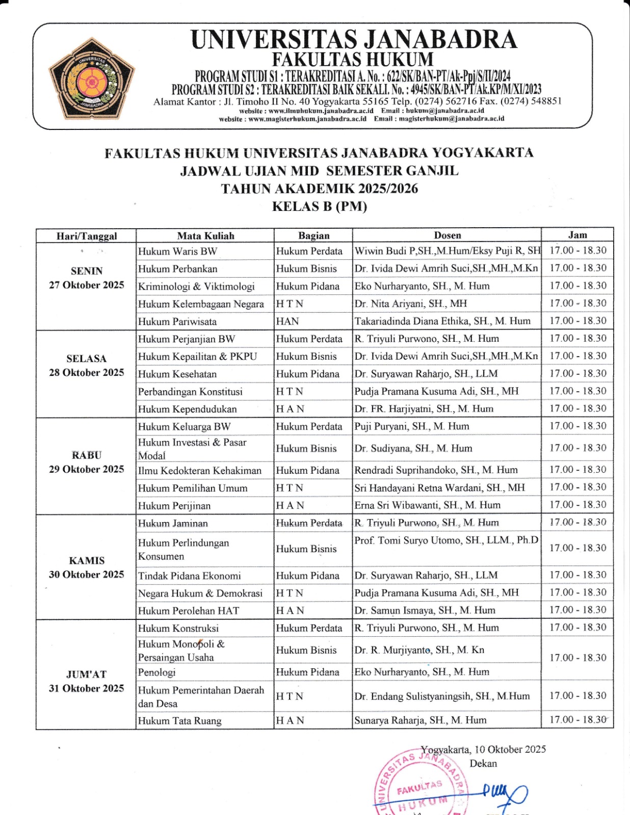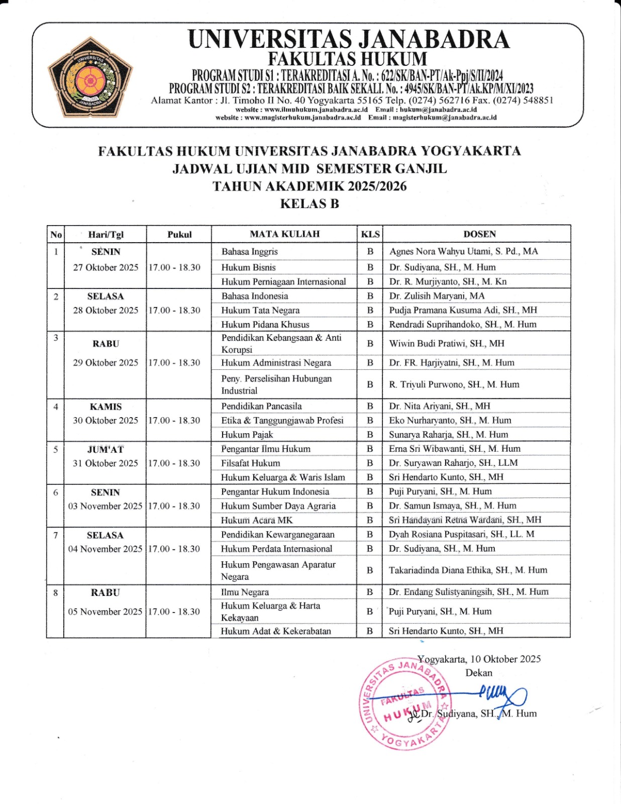 Jadwal Ujian Tengah Semester Ganjil TA 2025/2026 (Kelas B)