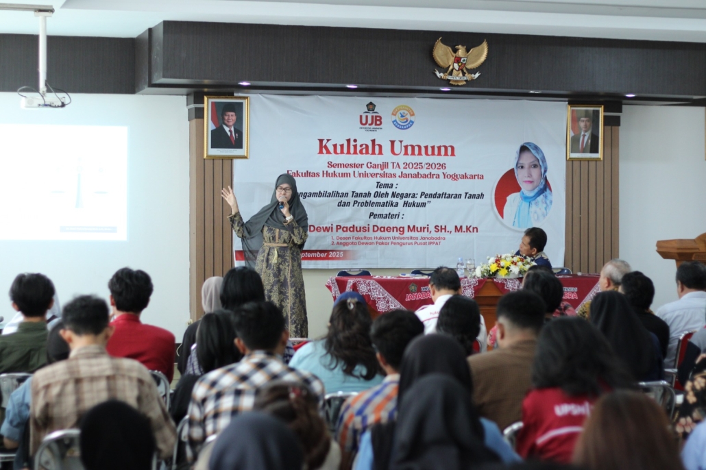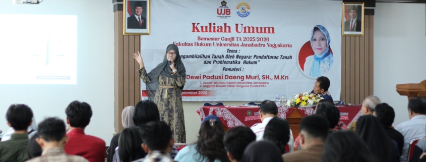 Dengan narasumber Dr. Dewi Padusi Daeng Muri, SH., MKn Dosen Fakultas Hukum Universitas Janabadra Yogyakarta. Sebagai tradisi ilmiah yang tengah berjalan setiap awal semester, kegiatan Kuliah Umum dihadiri oleh para dosen, seluruh mahasiswa fakultas hukum dan beberapa tamu undangan dari berbagai Instansi yang sesuai dengen tema kuliah. Hadir beberapa Kepala kantor ATR/Badan Pertanahan Nasional di Daerah Istimewa Yogyakarta.
