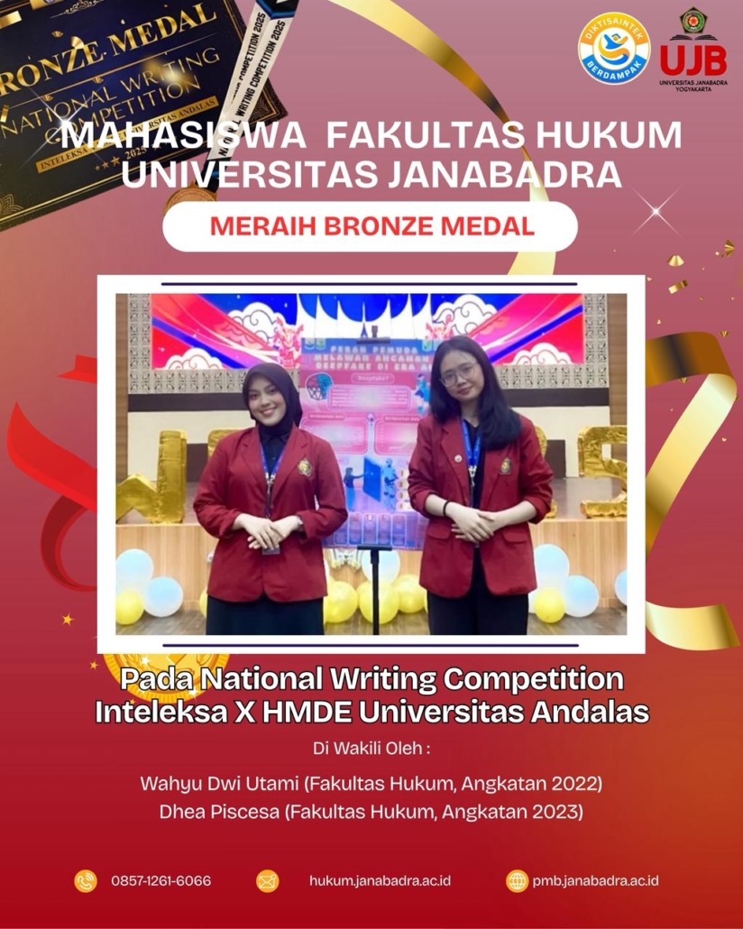 Pada tanggal 31 Oktober 2025 s.d 03 November 2025, Fakultas Hukum Universitas Janabadra mengirimkan wakil dua mahasiswanya pada kompetisi National Writing Competition 2025. Ajang ini diadakan oleh Inteleksa X HMDE Universitas Andalas. Dalam kompetisi tersebut, Fakultas Hukum Universitas Janabadra mengirim dua orang perwakilan yakni: Dwi Utami (mahasiswa angkatan 2022) dan Dhea Piscesa (mahasiswa angkatan 2023).