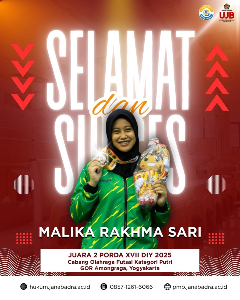 Fakultas Hukum Universitas Janabadra kembali lagi menorehkan prestasi, kali ini dalam cabang olahraga futsal kategori putri. Dalam ajang Porda XVII DIY 2025 yang dilaksanakan di GOR Amongrogo, Yogyakarta mahasiswi Fakultas Hukum Universitas Janabadra yaitu Malika Rakhma Sari meraih juara 2. Kejuaraan Porda XVII DIY 2025 merupakan event nasional yang diikuti oleh berbagai atlet dari tingakatan di wilayah DIY dan menjadi kebanggan di masing-masing daerah kabupatennya.