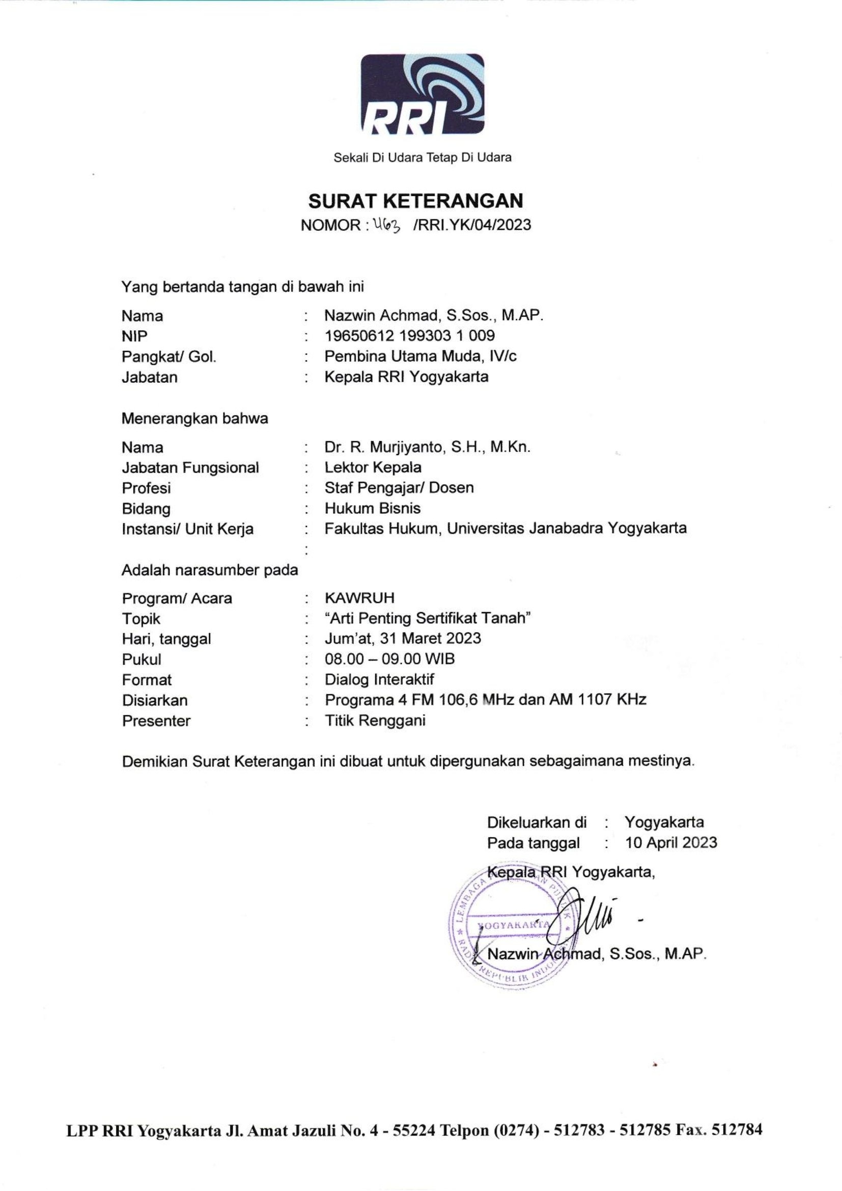Pada hari Jum’at, tanggal 31 Maret 2023 Dr. R. Murjiyanto, SH., M.Kn sebagai Narasumber dalam Dialog Interaktif Kawruh dengan tema “Arti Penting Sertifikat Tanah” yang disiarkan lngsung oleh Stasiun RRI PRO 4. Dalam acara dialog tersebut disampaikan materi dari narasumber dan dilanjutkan tanya jawab dari pemirsa RRI di beberapa daerah menyangkut Sertifikat tanah arti penting dan pendaftaran tanah.