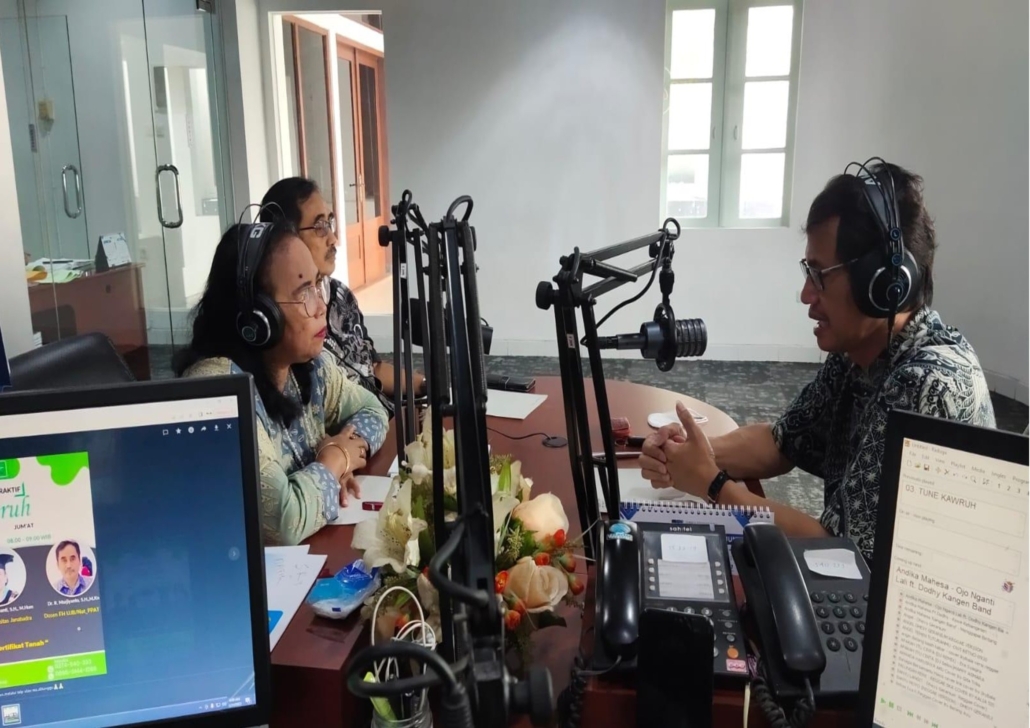 Pada hari Jum’at, tanggal 31 Maret 2023 Dr. R. Murjiyanto, SH., M.Kn sebagai Narasumber dalam Dialog Interaktif Kawruh dengan tema “Arti Penting Sertifikat Tanah” yang disiarkan lngsung oleh Stasiun RRI PRO 4. Dalam acara dialog tersebut disampaikan materi dari narasumber dan dilanjutkan tanya jawab dari pemirsa RRI di beberapa daerah menyangkut Sertifikat tanah arti penting dan pendaftaran tanah.