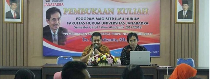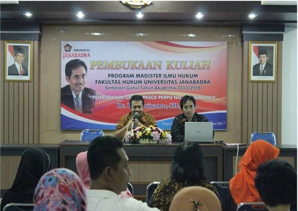 Pada tanggal 8 September 2017, Dr. R. Murjiyanto, SH., M.Kn, sebagai narasumber pembukaan kuliah Semester Ganjil Tahun Akademik 2017/ 2018 dengan topik : “Pembubaran Ormas Pasca Perpu Nomor 02 Tahun 2017”. Bertempat di Prodi Magister Hukum Fakultas Hukum Universitas Janabadra. Seiring dengan perkembangan kebebasan pembentukan organisasi kemasyarakatan yang dijamin oleh Konstitusi, tentang kebebasan berkumpul dan berpendapat, hingga maraknya pendirian ormas dengan berbagai asas dan maksud dan tujuan, namun tidak lepas juga persoalan yang ditimbulkan dari keberadaan ormas yang kemungkinan justru dapat menimbulkan ancaman bagi persatuan dan kesatuan bangsa, menimbulkan perpecahan dan mengancam keutuhan Negara Kesatuan Republik Indonesia. Oleh karena itu keberadaan organisasi kemasyarakat disamping dijamin kebebasan namun juga harus ada pembatasan-pembatasan yang harus diperhatikan demi kesatuan dan persatuan bangsa. Dalam pembukaan kuliah materi tersebut dipaparkan oleh narasumber dan dilanjutkan dengan tanya jawab, dengan dimoderatori oleh JS. Murdomo, SH., M.Hum.