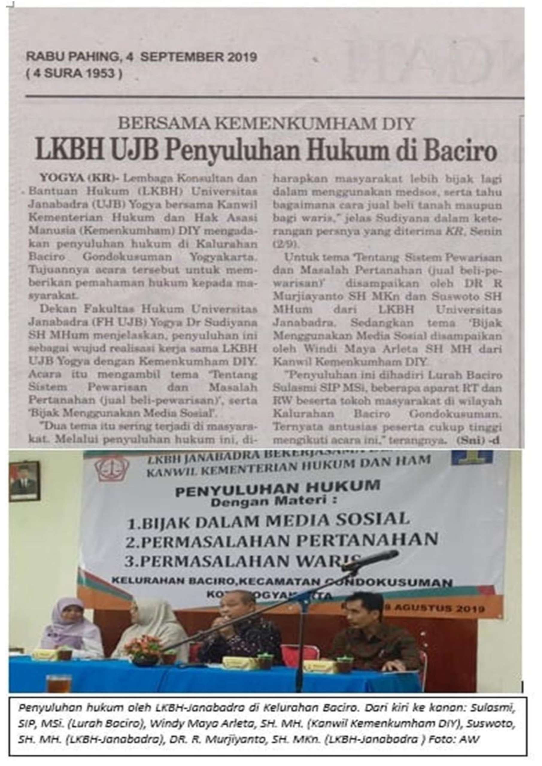 LKBH JANABADRA HADIRKAN DOKTOR R. MURJIYANTO, SUSWOTO, SH, M.Hum DAN WINDY MAYA ARLETA, SH. MH, SEBAGAI NARASUMBER SOSIALISASI HUKUM