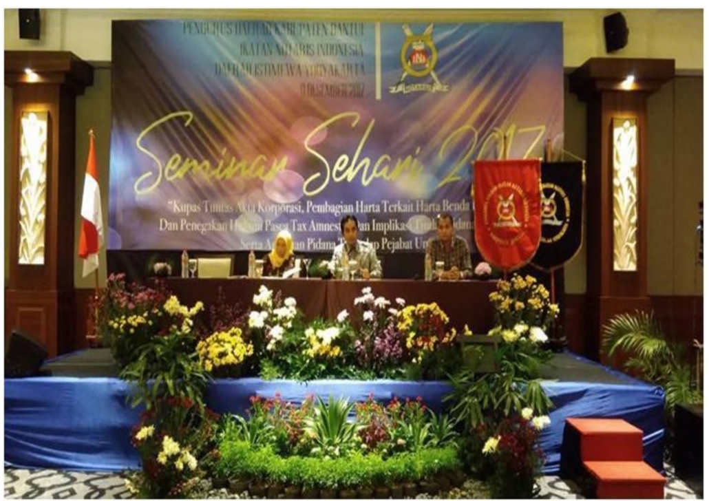 Seminar ini diselenggarakan oleh Pengurus Daerah Kabupaten Bantul Ikatan Notaris Indonesia Daerah Istimewa Yogyakarta. Kegiatan Seminar Nasional ini menghadirkan narasumber, diantaranya: