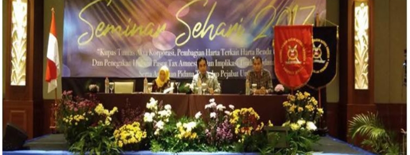 Pada hari Sabtu, 11 Desember 2017 Dr. R. Murjiyanto, SH., M.Kn menjadi narasumber dalam acara Seminar Nasional dengan topik “ Kupas Tuntas Akta Korporasi, Pembagian Harta Terkait Harta Benda Dan Penegakan Hukum Pasca Tax Amnesty Dan Implikasi Tindak Pidana Sera Ancaman Pidana Terhadap Pejabat Umum”.