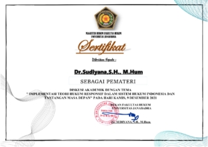 Pada hari Kamis, tanggal 09 Desember 2021. Dr. Sudiyana, SH., M.Hum sebagai Pemateri dalam Diskusi Akademik dengan tema “Implementasi Teori Hukum Responsif Dalam Sistem Hukum Indonesia dan Tantangan Masa Depan”, yang diadakan oleh Magister Hukum Fakultas Hukum Universitas Janabadra.