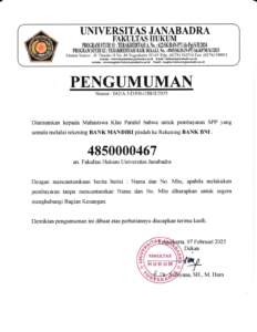 Pembayaran SPP/UKT diwajibkan mencantumkan nama dan no mahasiswa saat melakukan pembayaran, dan jika tidak mencantumkan nama dan no mahasiswa mohon segera menghubungi bagian keuangan dengan menunjukkan bukti bayar.