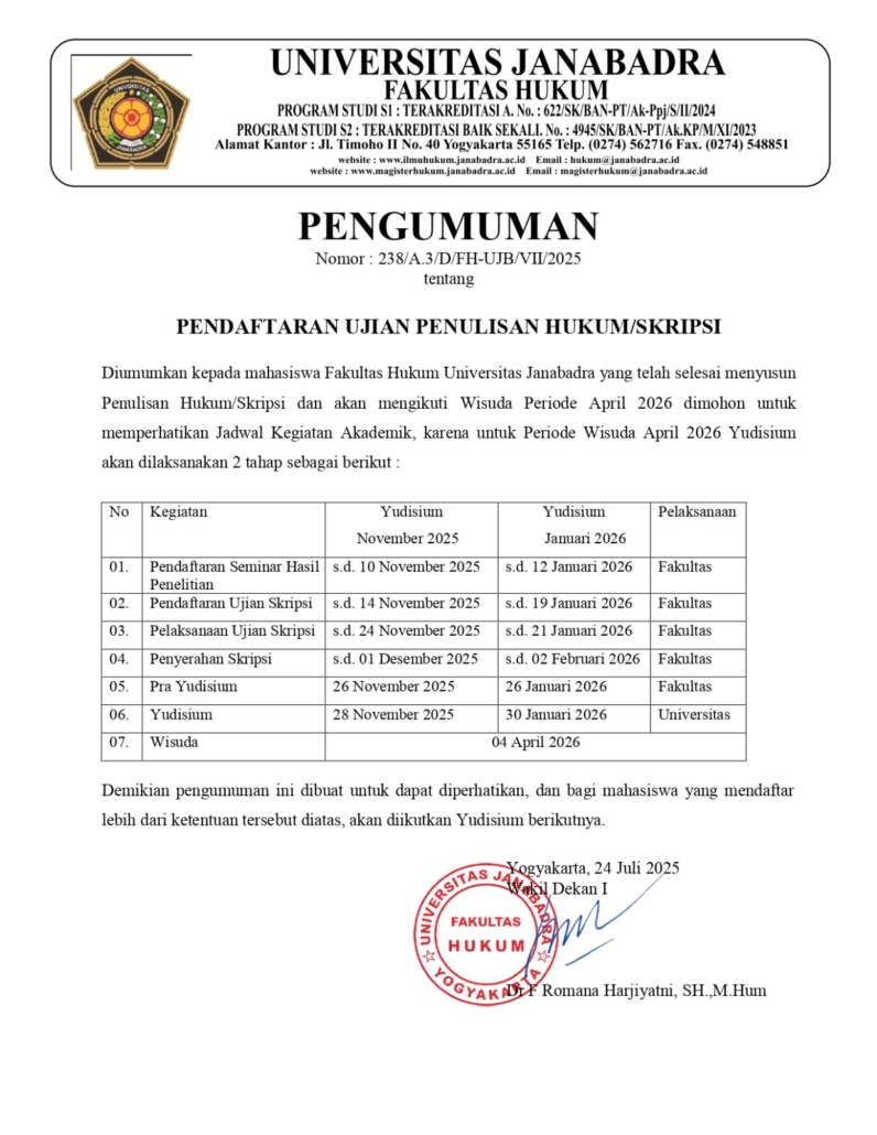 Diinfokan kepada seluruh mahasiswa Fakultas Hukum Universitas Janabadra yang sudah menyelesaikan Penulisan Hukum/Skripsi dan akan mengikuti Wisuda Periode April 2026 dimohon untuk memperhatikan jadwal Kegiatan Akademik, dikarenakan untuk Periode Wisuda April 2026 Yudisium akan dilaksanakan dua tahap sebagai berikut: