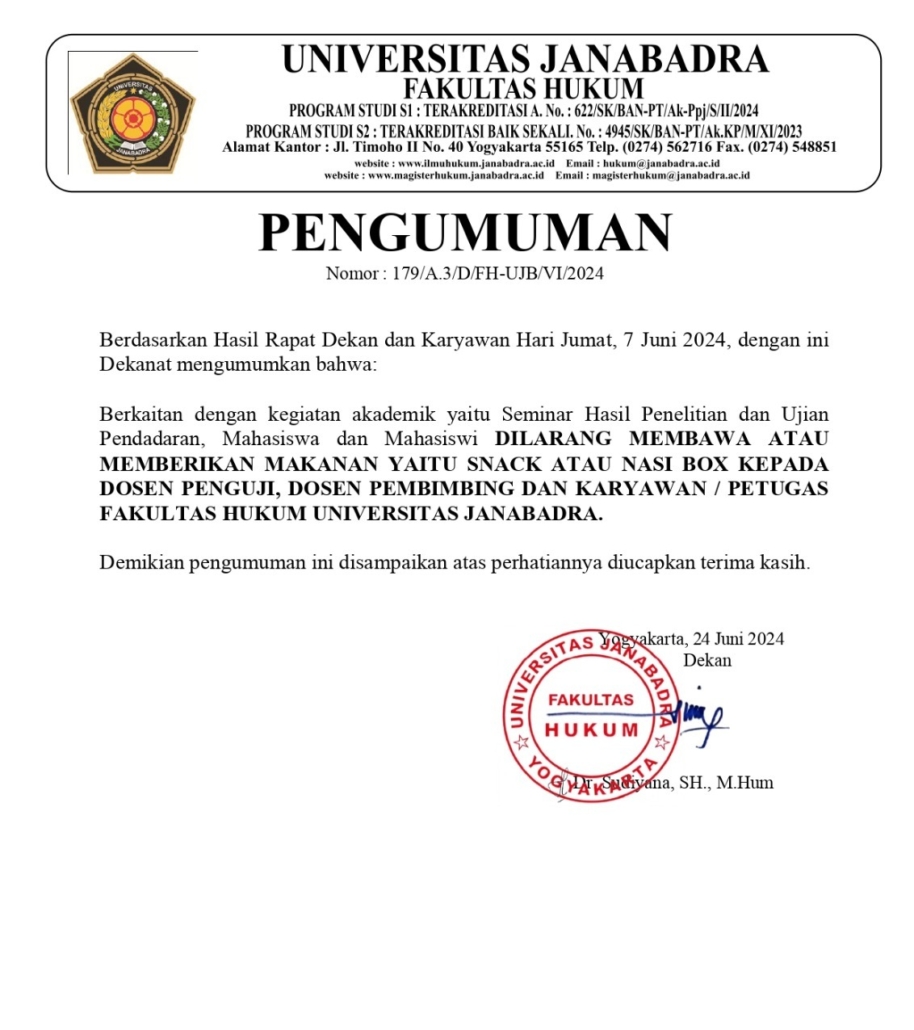 “Dilarang membawa atau memberikan makanan yaitu snack atau nasi box kepada dosen penguji, dosen pembimbing dan karyawan atau petugas Fakultas Hukum Universitas Janabadra”