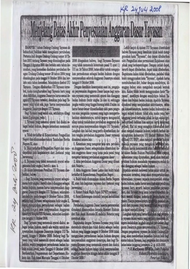 Dr. R. Murjiyanto, SH., M.Kn, sebagai penulis Opini media di Kedaulatan Rakyat yang terbit Tanggal 24 Juli 2008 dengan judul : “Menjelang Batas Akhir Penyesuaian Anggaran Dasar Yayasan”.  Sebagaimana Undang-Undang Nomor 16 Tahun 2001 Terntang Yayasan yang kemudian dirubah dengan Undang-Undang Nomor 28 Tahun 2004, bahwa Yayasan yang sudah ada sebelum lahir Undang-Undang Yayasan diakui sebagai badan hukum Yayasan namun demikian harus menyesuaikan Anggaran Dasarnya dan diberitahukan kepada Kementerian yang membidangi hukum sesuai dengan syarat dan prosedur serta batas waktu yang ditentukan oleh Undang-Undang. Bagi Yayasan yang tidak memenuhi kewajiban menyesuaikan anggaran dasarnya maka memberikan konsekuensi hukum tidak diperbolehkan menggunakan nama Yayasan didepan namanya yang dapat dimaknai secara Yuridis Yayasan tersebut dianggap tidak ada. Tentu hal ini memberikan konsekuensi terhadap tanggungjawab yang harus ditanggung oleh masing-masing individu di dalam Yayasan.