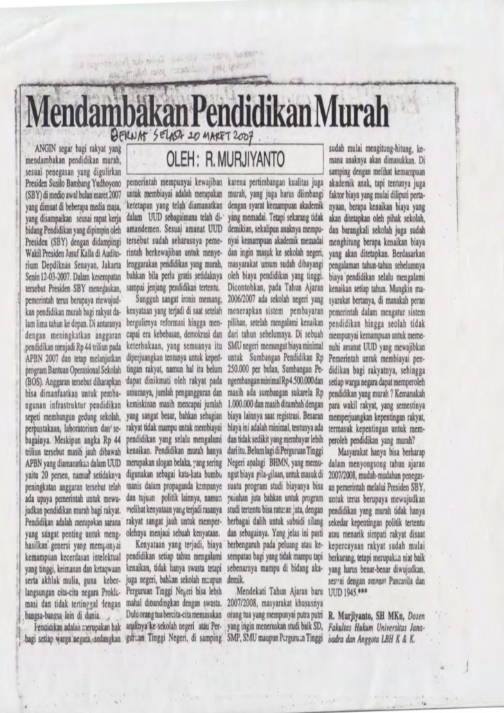 Dr. R. Murjiyanto, SH., M.Kn, sebagai penulis Opini di media Berita Nasional (Bernas) Jogja yang terbit tanggal 20 Maret 2007 dengan judul : “Mendambakan Pendidikan Murah”. Pada dasarnya setiap warga negara berhak untuk memperoleh jaminan Pendidikan. Hal ini dapat terwujud salah satunya adalah terselenggaranya pendidikan dengan biaya murah dan terjangkau bagi seluruh warga masyarakat.