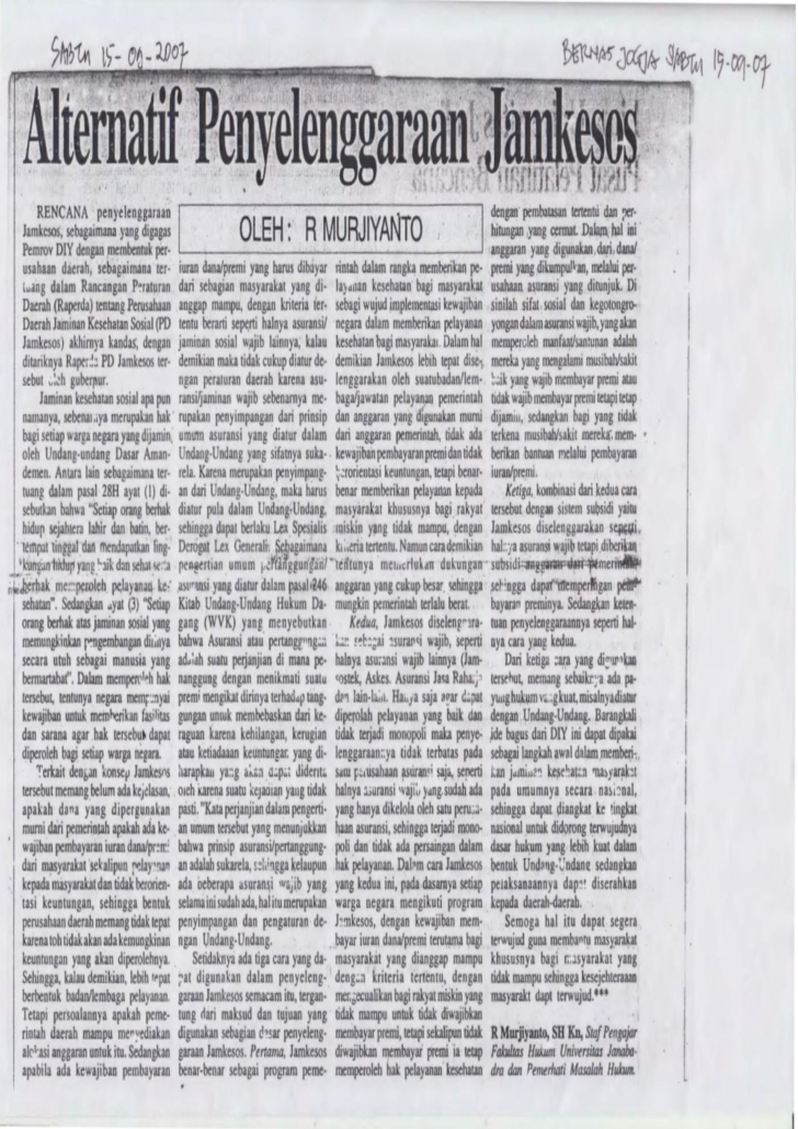 Dr. R. Murjiyanto, SH., M.Kn, sebagai penulis Opini di media Berita Nasional (Bernas) Jogja yang terbit tanggal 15 September 2007 dengan judul : “Alternatif Penyelenggaraan Jamkesos”. Jaminan Kesehatan Sosial pada mulanya merupakan program daerah Daerah Istimewa Yigyakarta (DIY) dalam rangka memberi jaminan Kesehatan bagi warga Masyarakat secara gotong royong melalui program Jamkesos, yang semula disusun dalam bentuk Rancangan Peraturan Daerah (Raperda) Tentang Perusahaan Jaminan Kesehatan Sosial (PD Jamkesos).