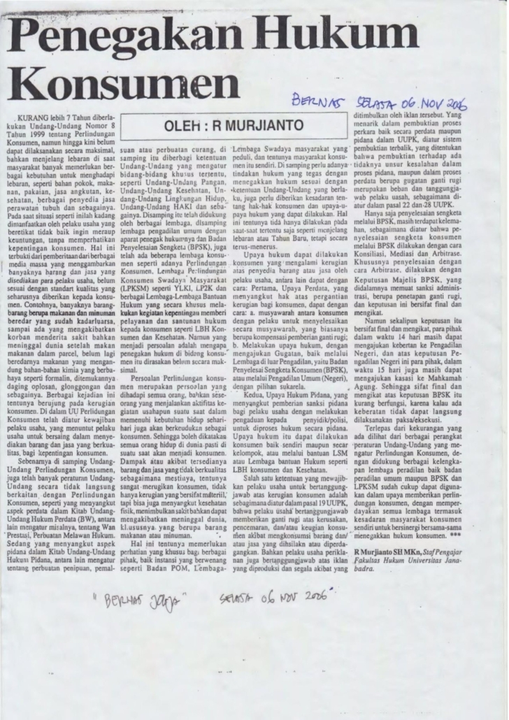 Dr. R. Murjiyanto, SH., M.Kn, sebagai penulis Opini di media Berita Nasional (Bernas) Jogja yang terbit Tanggal 06 November 2006 dengan judul : “Penegakan Hukum Konsumen”. Lahirnya Undang-Undang Nomor 8 Tahun 1999 tentang Perlindungan Konsumen belum sepenuhnya menjamin perlindungan konsumen yang kalau dihadapkan kepada pelaku usaha selalu dalam posisi yang lemah. Masih munculnya kasus produk yang tidak layak dikonsumsi Masyarakat, baik dari aspek kandungan dalam produk yang membahayakan kesehatan, maupun produk yang sudah kadaluwarsa masih tetap beredar di Masyarakat. Masih belum adanya kesadaran Sebagian pelaku usaha baik produsen maupun pedagang yang hanya berorientasi keuntungan semata, tanpa memperhatikan konsumen. Kondisi tersebut perlu adanya upaya bersama dari berbagai pihak agar antara kepentingan pelaku usaha dan konsumen terdapat adanya keseimbangan dalam pemenuhan hak dan kewajibannya.