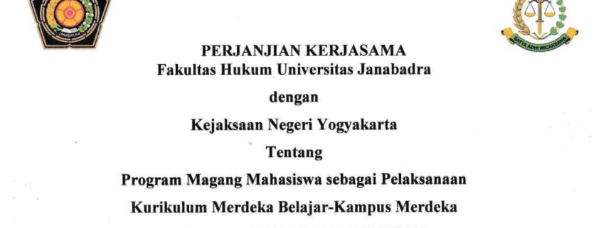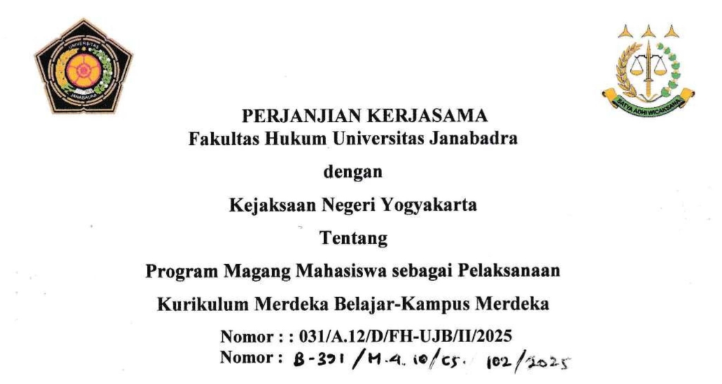 Fakultas Hukum Universitas Janabadra melakukan perjanjian kerjasama dengan Kejaksaan Negeri Yogyakarta tentang “Program Magang Mahasiswa sebagai Pelaksanaan Kurikulum Merdeka Belajar-Kampus Merdeka”. Pada hari Selasa, 11 Februari 2025 telah ditandatangi surat perjanjian kerjasama. Dalam hal ini, selaku pihak pertama Dekan Fakultas Hukum Universitas Janabadra Dr. Sudiyana, SH., M.Hum dan selaku pihak kedua Kepala Kejaksaan Negeri Yogyakarta Dr. Suroto, SH., MH.