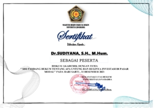 Pada hari Kamis, tanggal 11 Desember 2021. Dr. Sudiyana, SH., M.Hum sebagai Peserta dalam Diskusi Akademik dengan tema “Sisi Pandang Hukum Tentang Apa Untung dan Ruginya Investasi di Pasar Modal”, yang diadakan oleh Magister Hukum Fakultas Hukum Universitas Janabadra.