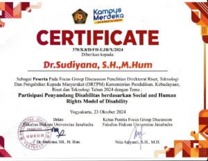 Pada tanggal 23 Oktober 2024, Dr. Sudiyana. SH., M.Hum sebagai Peserta pada Focus Group Discussion Penelitian Direktorat Riset, Teknologi, dan Pengabdian Kepada Masyarakat (DRTPM) Kementerian Pendidikan, Kebudayaan, Riset dan Teknologi Tahun 2024. Mengangkat tema “Partisipasi Penyandang Disabilitas berdasarkan Social and Human Rights Model of Disability”. Acara ini diselenggarakan oleh Fakultas Hukum Universitas Janabadra, dan bertempat di Hotel Horison Yogyakarta.