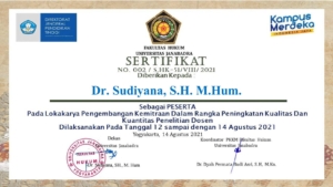 Pada tanggal 12 Agustus 2021 s.d 14 Agutsu 2021, Dr. Sudiyana, SH., M.Hum menjadi Peserta “Loka Karya Pengembangan Kemitraan Dalam Rangka Peningkatan Kualitas dan Kuantitas Penelitian Dosen”.