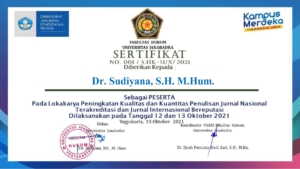 Pada tanggal 12 Oktober 2021 s.d 13 Oktober 2021, Dr. Sudiyana, SH., M.Hum sebagai peserta pada “Lokakarya Peningkatan Kualitas dan Kuantitas Penulisan Jurnal Nasional Terakreditasi dan Jurnal Internasional Bereputasi”. Kegiatan tersebut diselenggarakan oleh Fakultas Hukum Universitas Janabadra, melalui media zoom meeting.