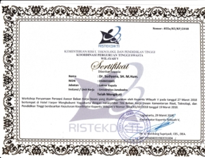 Dr. Sudiyana, SH., M.Hum telah mengikuti Workshop Penyamaan Persepsi Asesor Beban Kerja Dosen yang diselenggarakan oleh Kopertis Wilayah V, pada tanggal 27 Maret 2018 bertempat di Hotel Harper Mangkubumi Yogyakarta. Dengan narasumber Tim Beban Kerja Dosen Kementerian Riset, Teknologi, dan Pendidikan Tinggi berdasarkan Keputusan Koordinator Kopertis Wilayah V.
