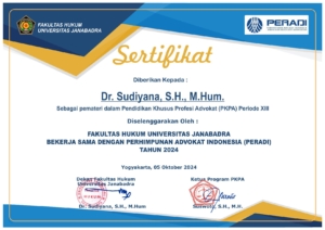 Fakultas Hukum Universitas Janabadra Yogyakarta, bekerjasama dengan Perhimpunan Advokat Indonesia (PERADI), pada tanggal 05 Oktober 2024. Dalam memberikan materi dalam Pendidikan Khusus Profesi Advokat (PKPA), Angkatan XIII.