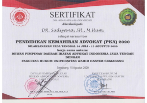 Memberikan Pendidikan Khusus Profesi advokat pada Program Pendidikan Kemahiran Advokat (PKA) yang diselenggarakan oleh Dewan Pimpinan Daerah Ikatan Advokat Indonesia (DPD IKADIN) Jawa Tengah. Pada hari Sabtu, 25 Juli 2020 bertempat di Universitas Wahid Hasyim Semarang.