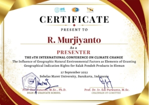 Pada tanggal 27-28 September 2023, Dr. R. Murjiyanto, SH.,M.Kn menjadi Presenter dalam Seminar Internasional : “The 9th International Conference on Climate Change (ICCC) 2023″. Seminar Internasional ini diselenggarakan oleh Universitas Sebelas Maret (UNS) Surakarta. Adapun makalah yang dipresentasikan dengan judul : The Influence of Geographic Natural Environmental Factors as Elements of Granting Geographical Indication Rights for Salak Pondoh Productsin Sleman.