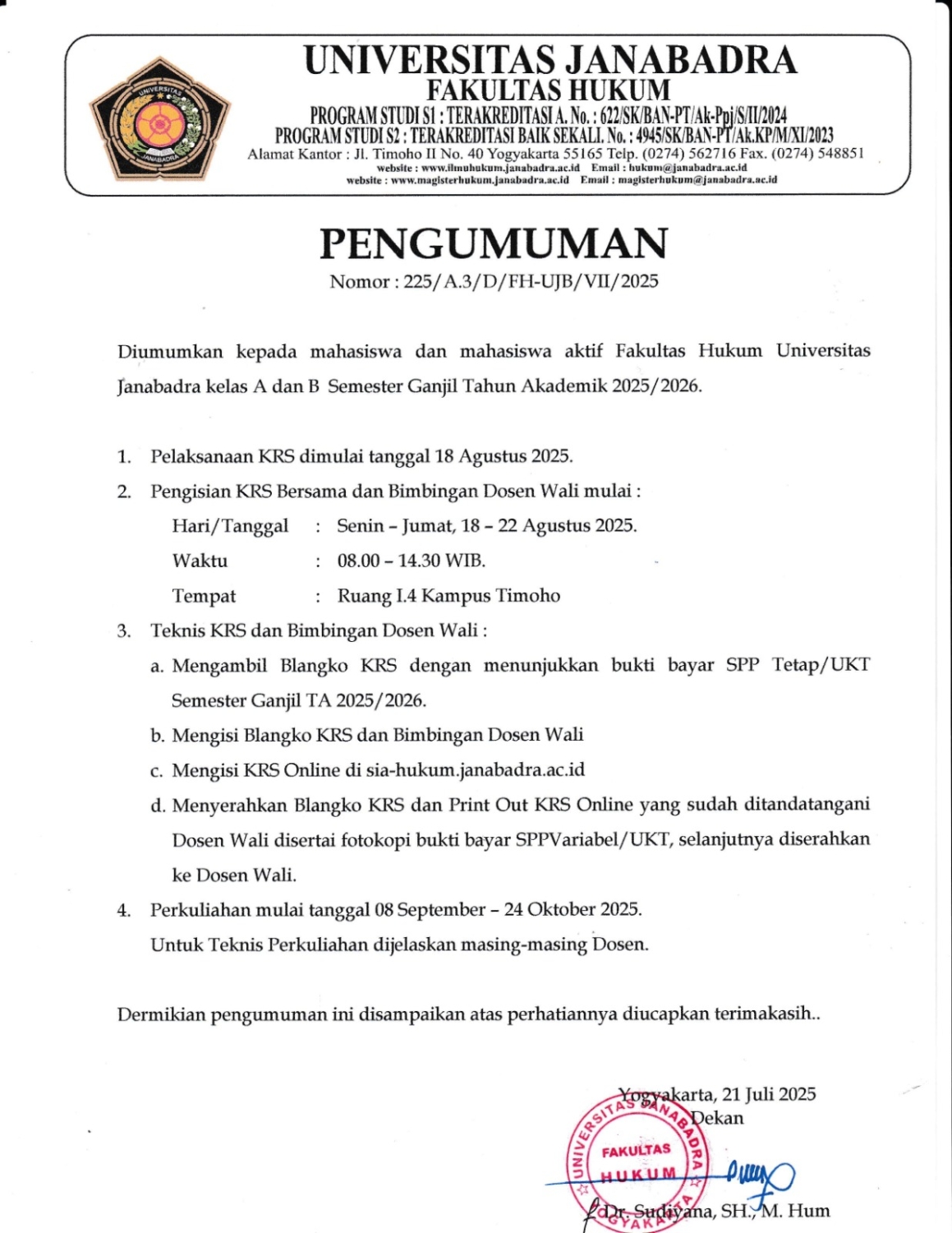 Berikut, informasi mengenai prosedur teknis pelaksanaan KRS, pengisian KRS bersama, bimbingan dengan dosen wali, sampai dengan tahap perkuliahan awal bagi mahasiswa Fakultas Hukum Universitas Janabadra kelas A dan B Semester Ganjil Tahun Akademik 2025/2026: