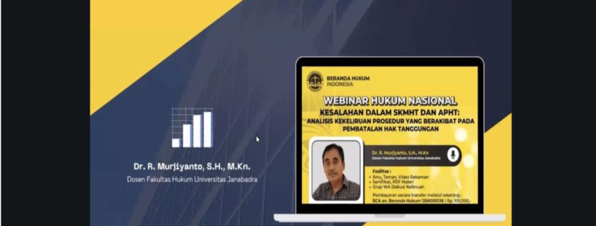 Tanggal 14 Desember 2025, Dr. R. Murjiyanto, S.H., M.Kn menjadi narasumber dalam Webinar Nasional dengan topik : “KESALAHAN DALAM SKMHT DAN AΡΗΤ: ANALISIS KEKELIRUAN PROSEDUR YANG BERAKIBAT PADA PEMBATALAN HAK TANGGUNGAN”. Kegiatan ini diselenggarakan oleh BERANDA HUKUM INDONESIA, yang bertujuan untuk untuk memberikan pemahaman kepada masyarakat profesi (Notaris, PPAT, Advokat, Legal, Developer, Praktisi Hukum) maupun masyarakat umum secara luas berkaitan tema yang akan diangkat.