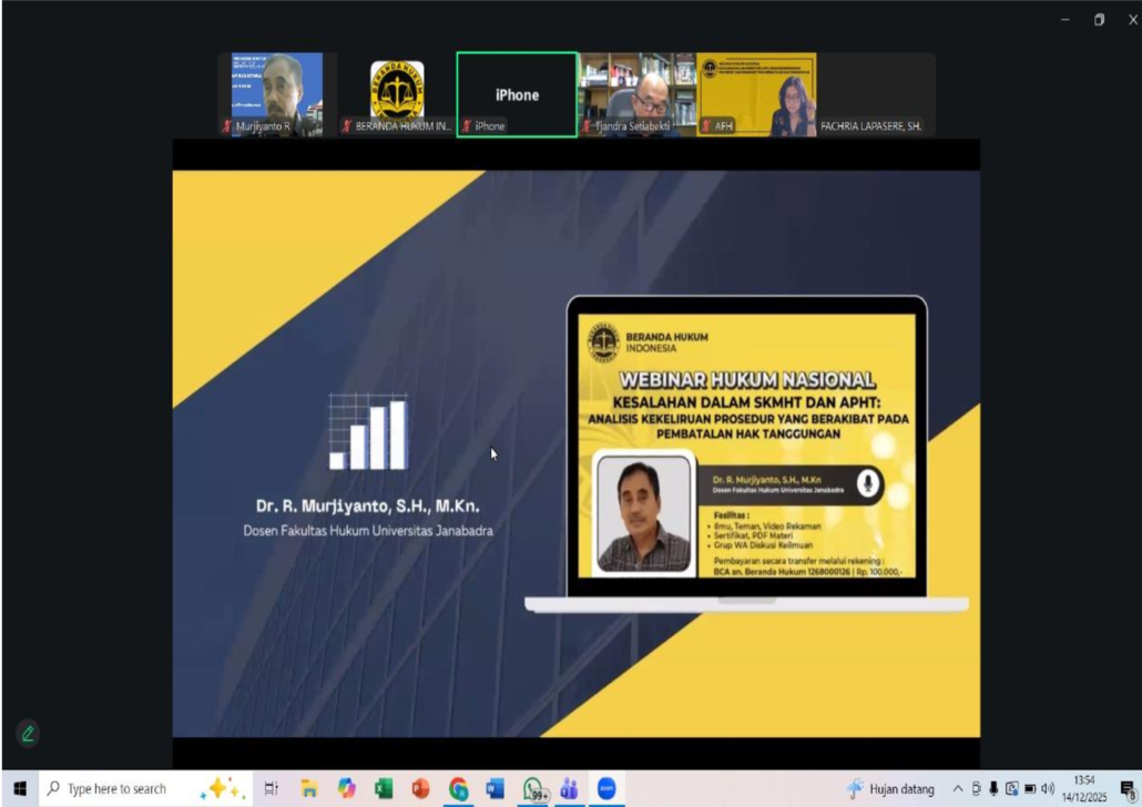 Tanggal 14 Desember 2025, Dr. R. Murjiyanto, S.H., M.Kn menjadi narasumber dalam Webinar Nasional dengan topik : “KESALAHAN DALAM SKMHT DAN AΡΗΤ: ANALISIS KEKELIRUAN PROSEDUR YANG BERAKIBAT PADA PEMBATALAN HAK TANGGUNGAN”. Kegiatan ini diselenggarakan oleh BERANDA HUKUM INDONESIA, yang bertujuan untuk untuk memberikan pemahaman kepada masyarakat profesi (Notaris, PPAT, Advokat, Legal, Developer, Praktisi Hukum) maupun masyarakat umum secara luas berkaitan tema yang akan diangkat.