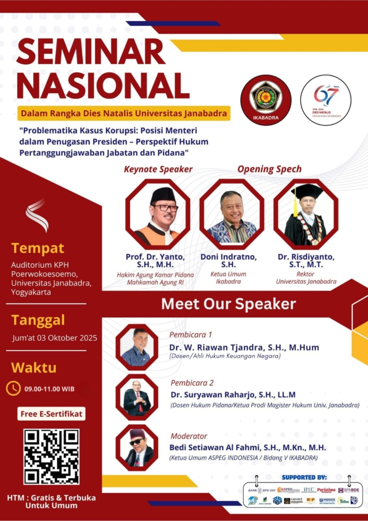 Mari hadiri Seminar Nasional dalam Rangka Dies Natalis Universitas janabadra dengan tema “Problematika Kasus Korupsi: Posisi Menteri dalam Penugasan Presiden-Perspektif Hukum Pertanggungjawaban Jabatan dan Pidana”.