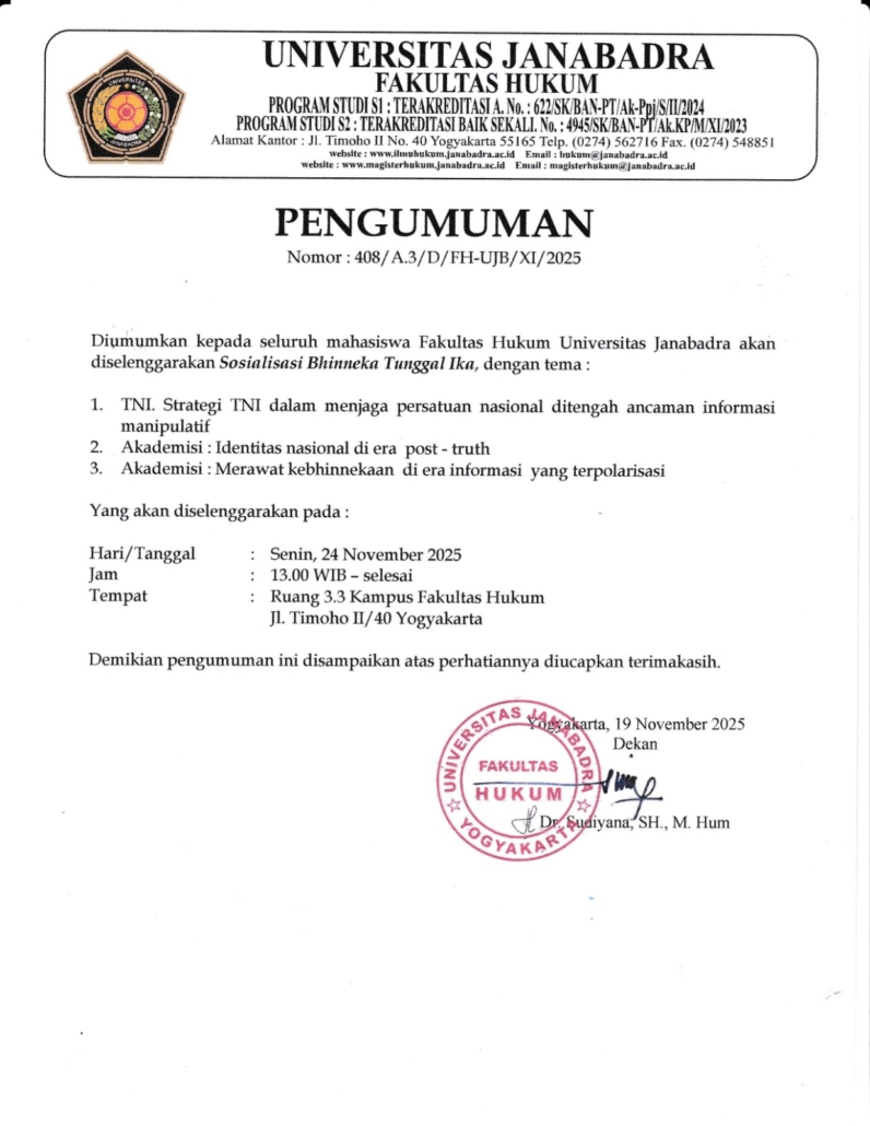 Diumumkan kepada seluruh mahasiswa Fakultas Hukum Universitas Janabadra akan diselenggarakan Sosialisasi Bhineka Tunggal Ika, dengan tema: