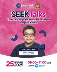 Jangan lewatkan! Ikuti SEEKTalks bersama Audy Laksana Putra, Marketing Manager Jobstreet by SEEK, yang akan membahas Tren Dunia Kerja dan Keterampilan Digital yang Dibutuhkan.