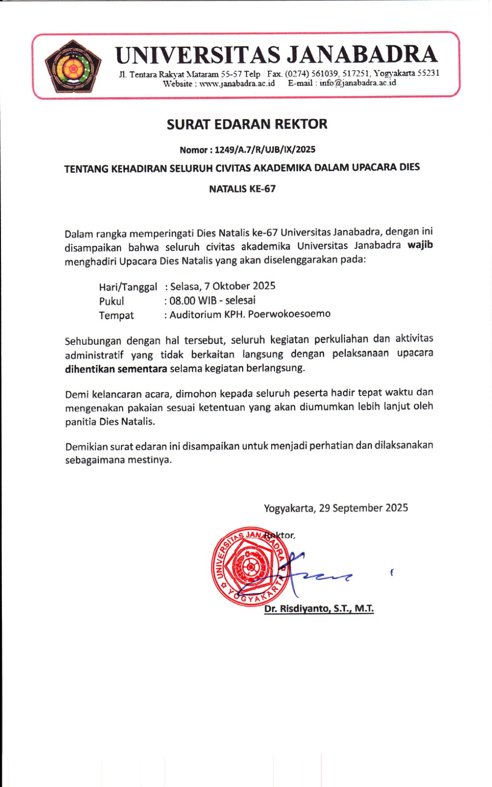 Berikut pengumuman mengenai kehadiran seluruh civitas akademi dalam upacara Dies Natalis ke-67, pada hari Selasa 07 Oktober 2025 pukul 08.00, bertempat di Auditorium KPH. Poerwokoesoemo.