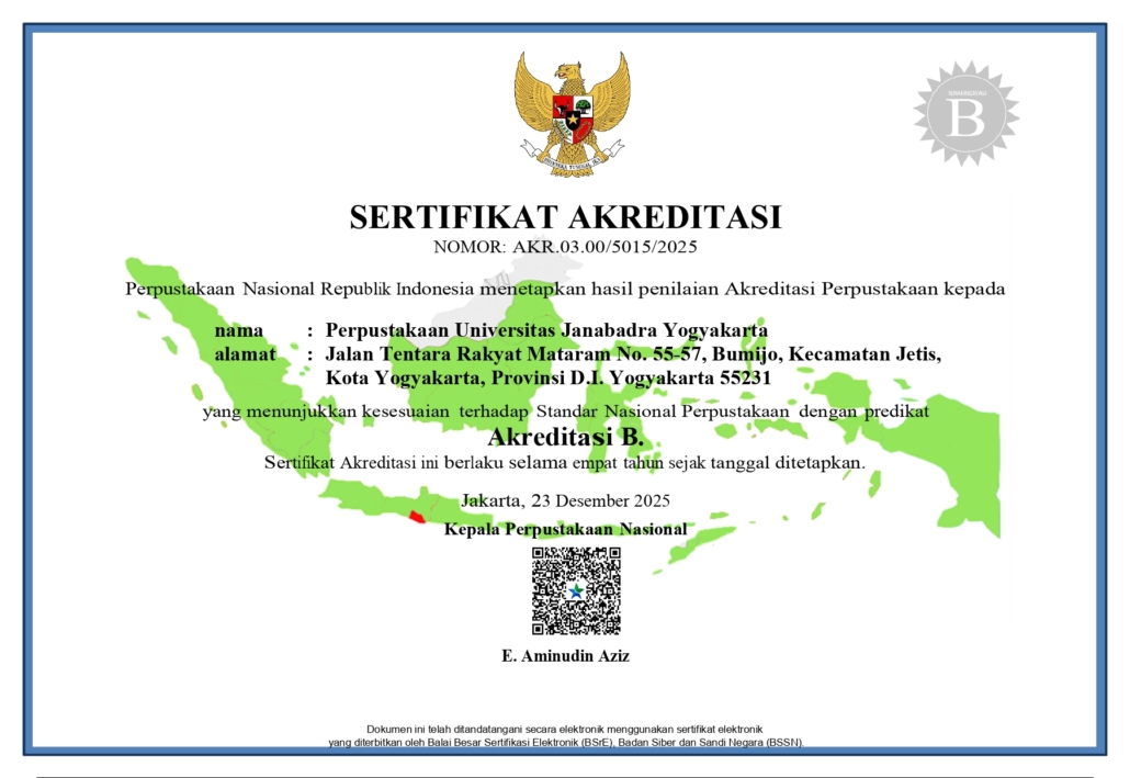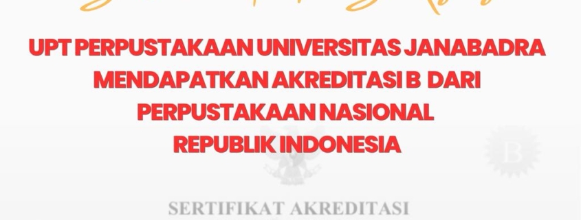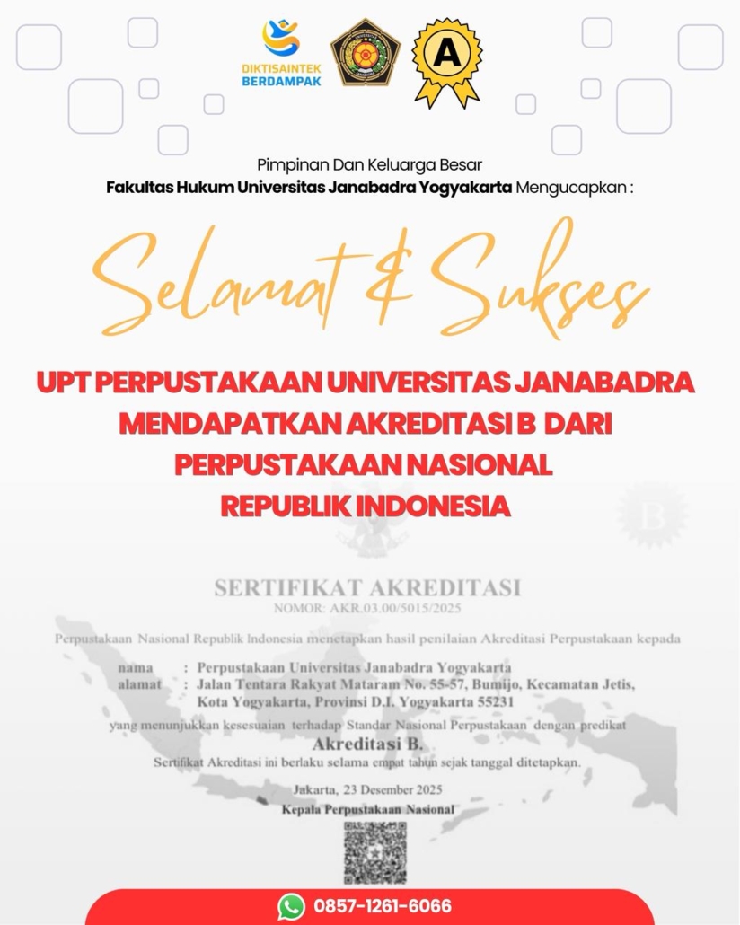 Segenap pimpinan dan keluarga besar Fakultas Hukum Universitas Janabadra mengucapkan Selamat & Sukses atas pencapaian UPT Perpustakaan Universitas Janabadra yang mendapatakan Akreditasi B dari Perpustakaan Nasional Republik Indonesia.