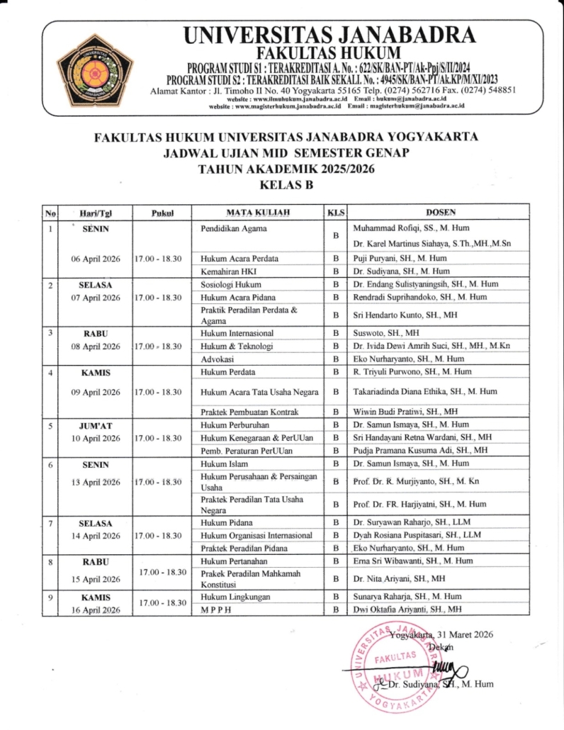 Berikut, jadwal Ujian Tengah Semester Genap TA 2025/2026 Kelas B: