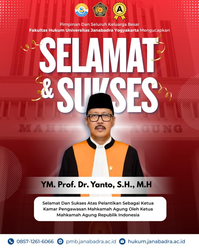 Kami segenap Pimpinan & Keluarga Besar Fakultas Hukum Universitas Janabadra mengucapkan Selamat & Sukses kepada YM. Prof. Dr. Yanto, SH., MH atas Pelantikan Sebagai Ketua Kamar Pengawasan Mahkamah Agung oleh Ketua Mahkamah Agung Republik Indonesia.