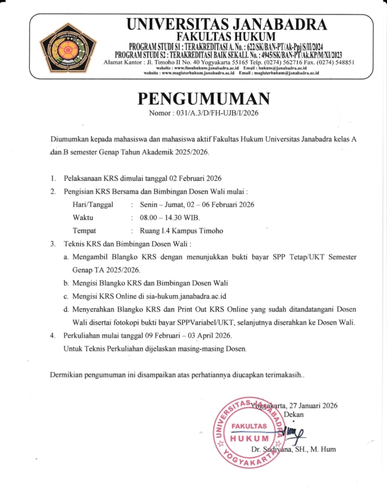 KRS Semester Genap TA 2025/2026PengumumanBerikut informasi mengenai jadwal KRS Semester Genap TA 2025/2026, sebagai berikut: January 30, 2026/by fh janabadra https://hukum.janabadra.ac.id/wp-content/uploads/2024/05/fh-300x88.png 0 0 fh janabadra https://hukum.janabadra.ac.id/wp-content/uploads/2024/05/fh-300x88.png fh janabadra2026-01-30 15:56:332026-01-30 15:56:33KRS Semester Genap TA 2025/2026