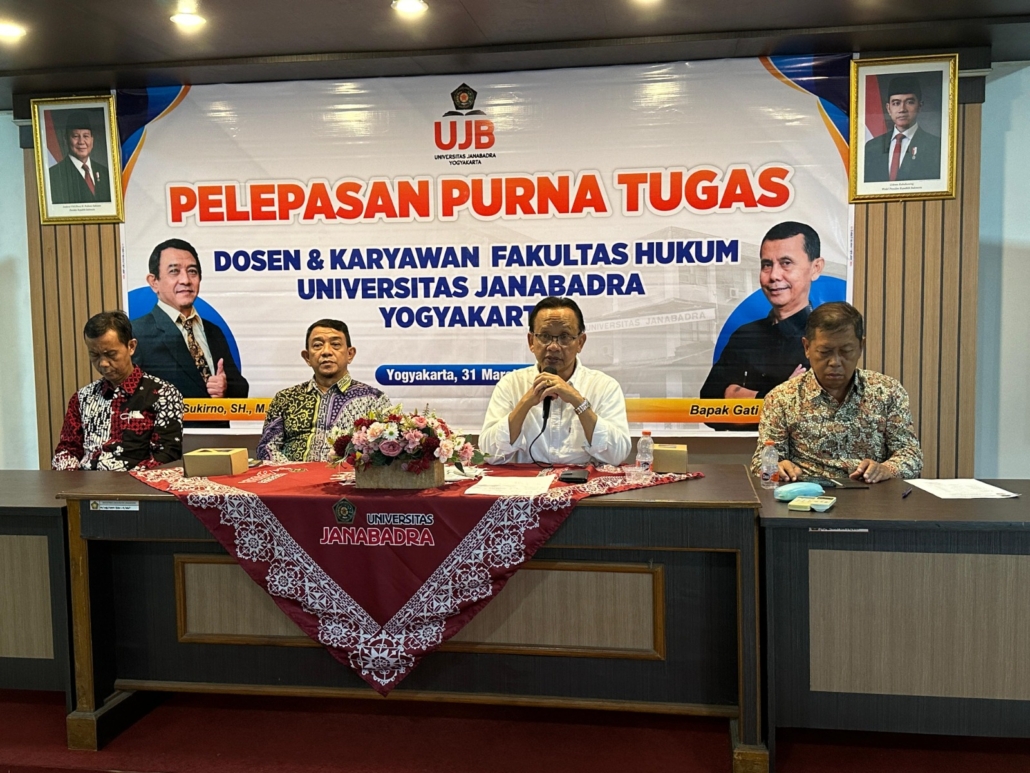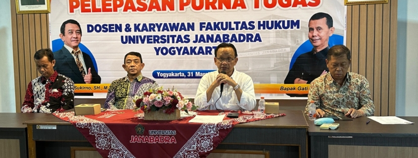 Selasa, 31 Maret 2026 bertempat di ruang 1.4 Kampus Timoho. Fakultas Hukum Universitas Janabadra mengadakan acara “Pelepasan Purna Tugas Dosen & Karyawan Fakultas Hukum Universitas Janabadra” terhadap satu dosen dan satu staff administrasi. Beliau merupakan Bapak Sukirno, SH., M.Hum yang merupakan salah satu dosen Fakultas Hukum Universitas Janabadra dan Bapak Gati Marwanto yang merupakan salah satu staff administrasi di Fakultas Hukum Universitas Janabadra.
