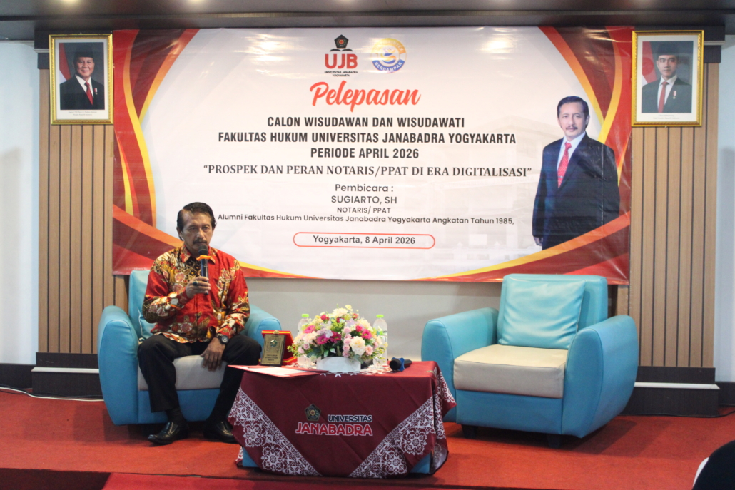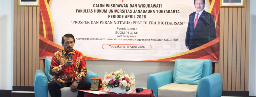 Bapak Sugiarto, SH sebagai pemateri dalam Pembekalan Calon Wisudawan dan Wisudawati periode April 2026. Beliau adalah alumni Fakultas Hukum Universitas Janabadra Tahun 1985. Profesi beliau adalah Notaris/PPAT.