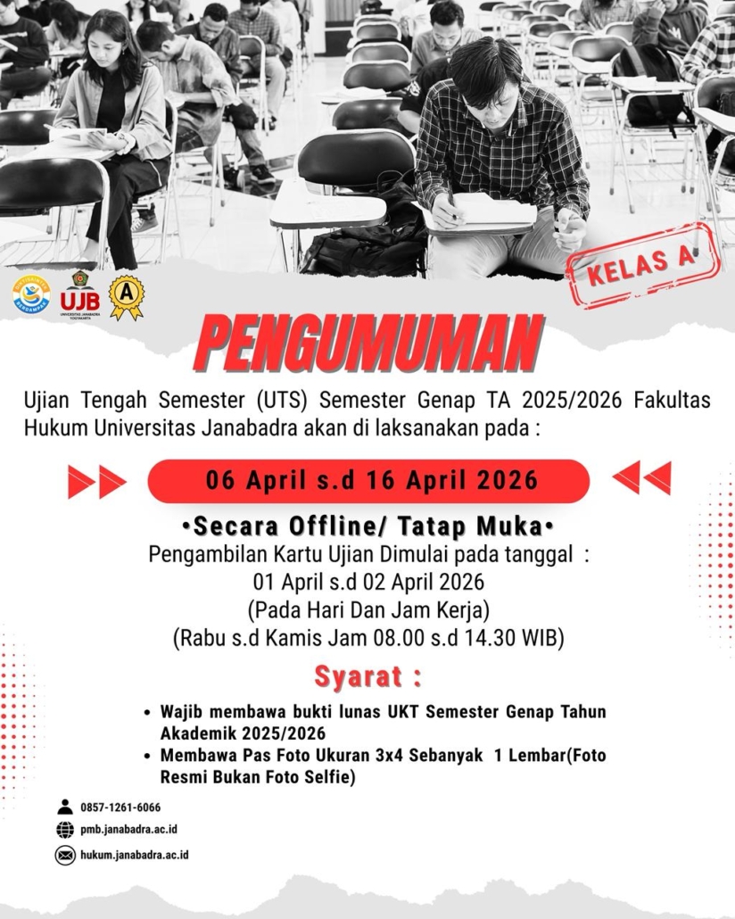 Pengambilan Kartu Ujian Tengah Semester Genap 2025/2026 Fakultas Hukum Universitas Janabadra, dimulai pada tanggal:
