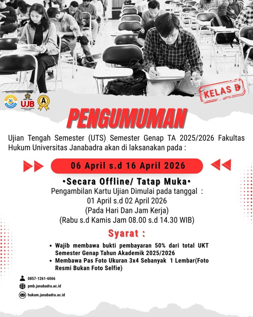 Pengambilan Kartu Ujian Tengah Semester Genap 2025/2026 Fakultas Hukum Universitas Janabadra, dimulai pada tanggal: