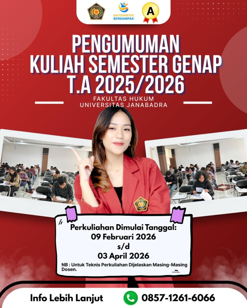 Pengumuman Kuliah Semester Genap TA 2025/2026PengumumanBerikut, informasi mengenai Perkuliahan Semester Genap TA 2025/2026: February 5, 2026/by fh janabadra https://hukum.janabadra.ac.id/wp-content/uploads/2024/05/fh-300x88.png 0 0 fh janabadra https://hukum.janabadra.ac.id/wp-content/uploads/2024/05/fh-300x88.png fh janabadra2026-02-05 08:57:022026-02-05 08:57:02Pengumuman Kuliah Semester Genap TA 2025/2026