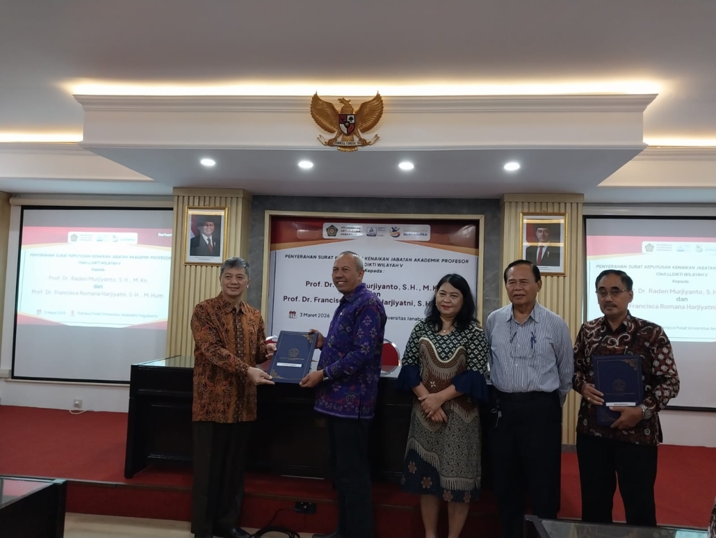 Pada hari Selasa, 03 Maret 2026 bertempat di Kampus Pusat Universitas Janabadra. Telah dilaksanakan “Penyerahan Surat Keputusan Kenaikan Jabatan Akademik Guru Besar/Profesor oleh Kepala Lembaga Layanan Pendidikan Tinggi (LLDIKTI) Wilayah V Yogyakarta saat ini adalah Prof. Setyabudi Indartono, M.M., Ph.D”.