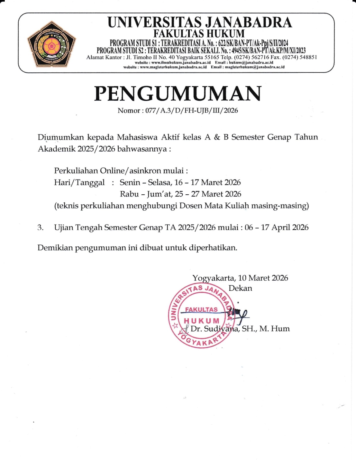 • Perkuliahan Online/Asinkron: Senin-Selasa 16-17 Maret 2026, Rabu-Jumat 25-27 Maret 2026