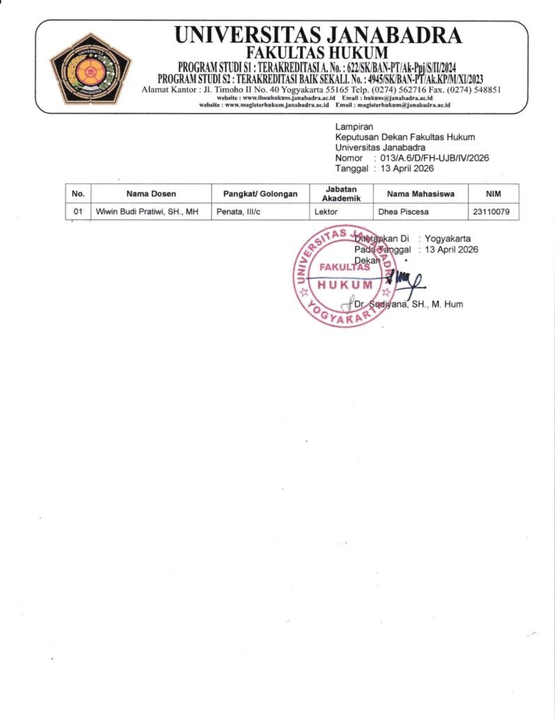SK Dosen Pembimbing JurnalPengumumanBerikut, informasi mengenai Penetapan Dosen Pembimbing Jurnal Semester Genap Tahun Akademik 2025/2026, guna membantu mahasiswa dan mahasiswi dalam menyelesaikan jurnal: April 14, 2026/by fh janabadra https://hukum.janabadra.ac.id/wp-content/uploads/2024/05/fh-300x88.png 0 0 fh janabadra https://hukum.janabadra.ac.id/wp-content/uploads/2024/05/fh-300x88.png fh janabadra2026-04-14 16:19:472026-04-14 16:19:47SK Dosen Pembimbing Jurnal